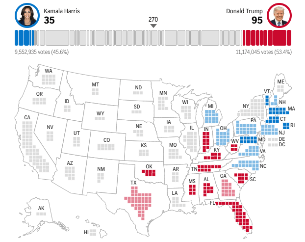 皇冠信用网登1_2024年美国大选最新动态:特朗普以95票对哈里斯35票暂时领先