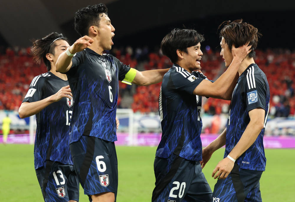 11月19日,日本队球员庆祝进球皇冠信用盘在哪里开通。新华社记者 贾浩成 摄