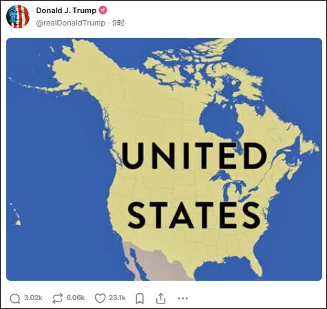特朗普在社交又发布了一张类似图片hga030 registration account 。在这张图中,加拿大和美国被涂成同一种颜色,上面用英文大写字母写着“美国”。