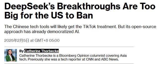 这篇文章的作者名叫凯瑟琳·索贝克(CatherineThorbecke),是彭博社关注亚洲科技动向的专栏作家皇冠信用网需要押金吗。在一篇于2月5日发布的文章中,索贝克首先表示尽管她个人非常希望看到一个中美在科技领域携手前进,良性竞争的局面,但她认为在当下的地缘政治氛围下,美国政府最终还是会像对待其他来自中国的科技产品一样,打着国家安全的旗号对DeepSeek下手封杀。