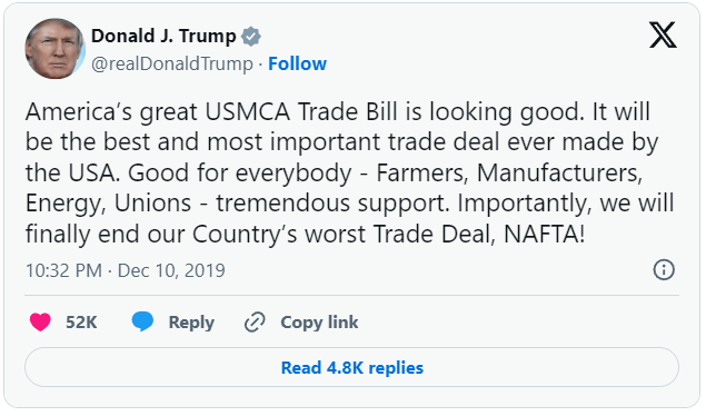 该协议由特朗普在2018年11月完成谈判,随后他和时任加拿大总理及墨西哥总统一同出席了协议签署仪式皇冠球网app 。根据美国国会官网的法案存档记录,该协议于 2020年1月被正式通过生效。