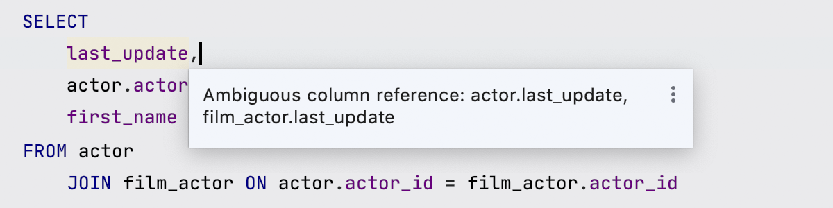 DataGrip 可以检测代码中可能出现的错误,并实时给出最佳修复方案正版皇冠信用网代理。 它可以立即提醒您未解析的对象、用作标识符的关键字,并且总会给出修复建议。