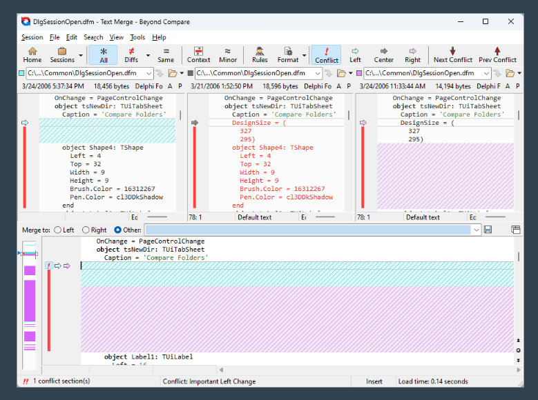 Beyond Compare的合并视图允许您将文件或文件夹的两个版本的更改合并到单个输出中正版皇冠信用网注册。 其智能方法使您可以快速接受大多数更改,同时仔细检查冲突。
