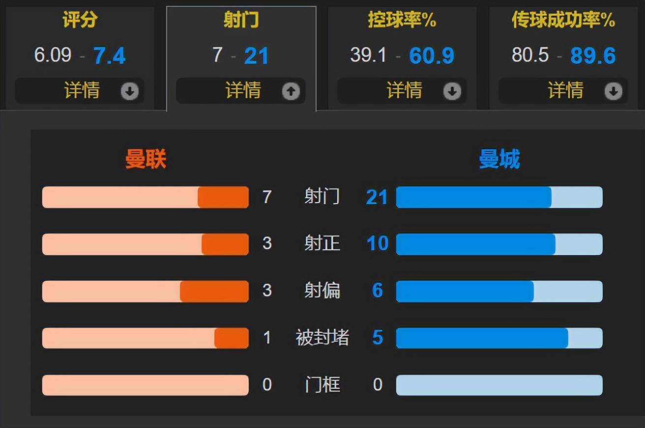 全场比赛,曼城的控球率为六成,狂射21脚,其中10次射正;曼联一共仅有7次射门,其中3次射正皇冠代理登1,2,3。奥纳纳全场7次扑救,非常神勇,无奈曼联整体不给力,完全不是曼城的对手。