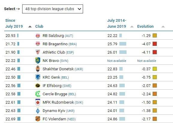 红牛系的另一支球队巴西俱乐部布拉甘蒂诺引进球员平均年龄为21.72岁,排名第二低萨尔茨堡红牛足球。此外进入前十名的球队还包括斯洛文尼亚球队NK Bravo、两支乌克兰俱乐部(顿涅茨克矿工和基辅迪纳摩)、两支比利时球队(亨克和布鲁日)、一支瑞典球队(埃尔夫斯堡)和一支斯洛伐克球队(鲁容贝罗克)。