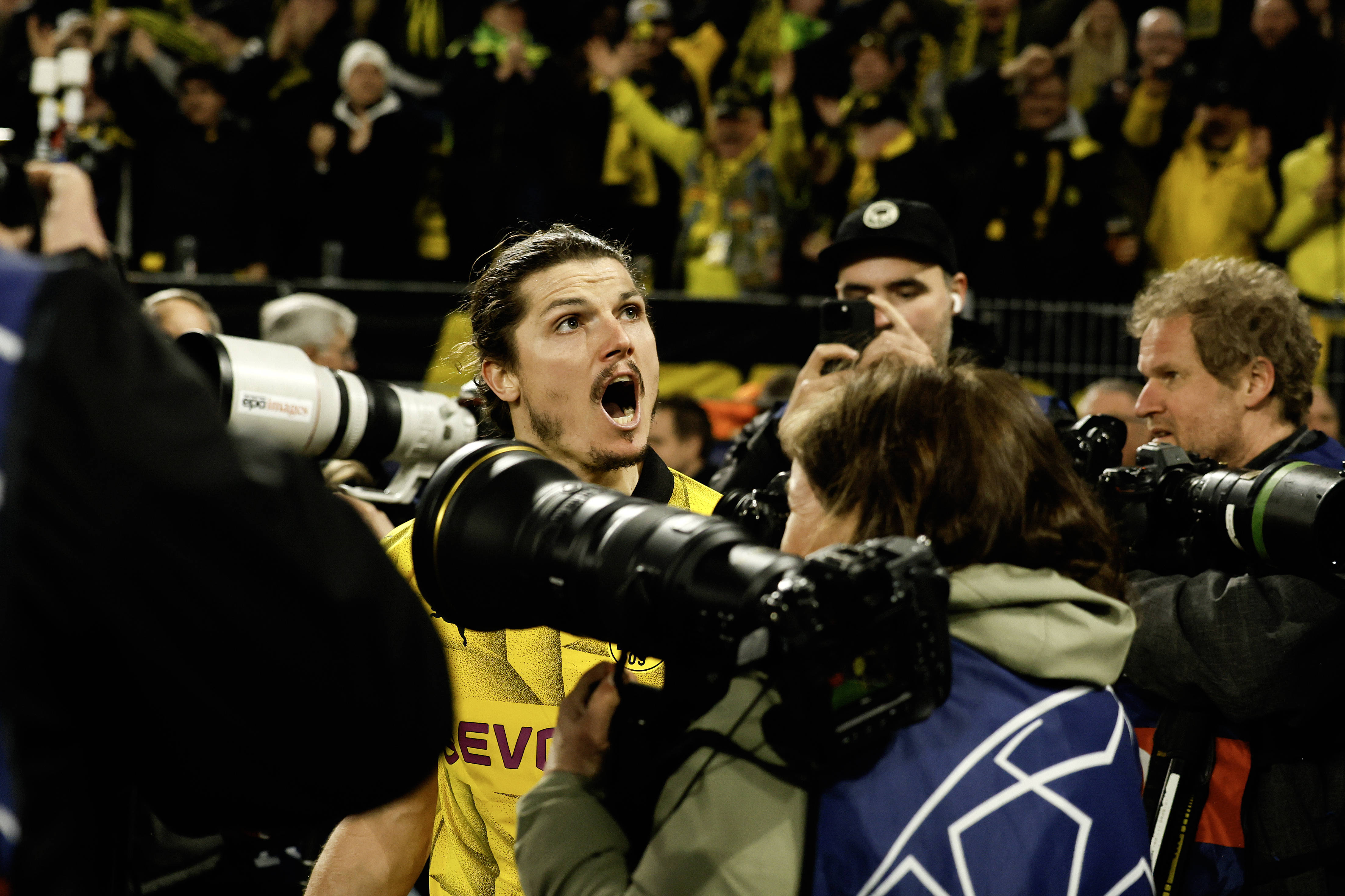 4月16日,多特蒙德队球员马特森进球后庆祝多特蒙德足球。